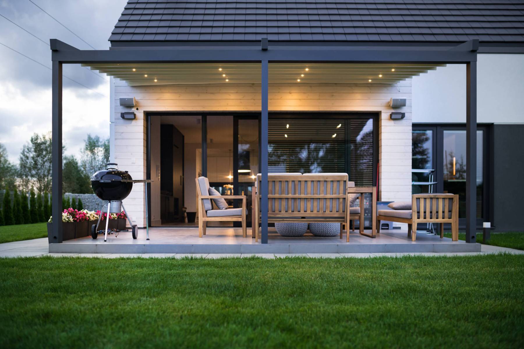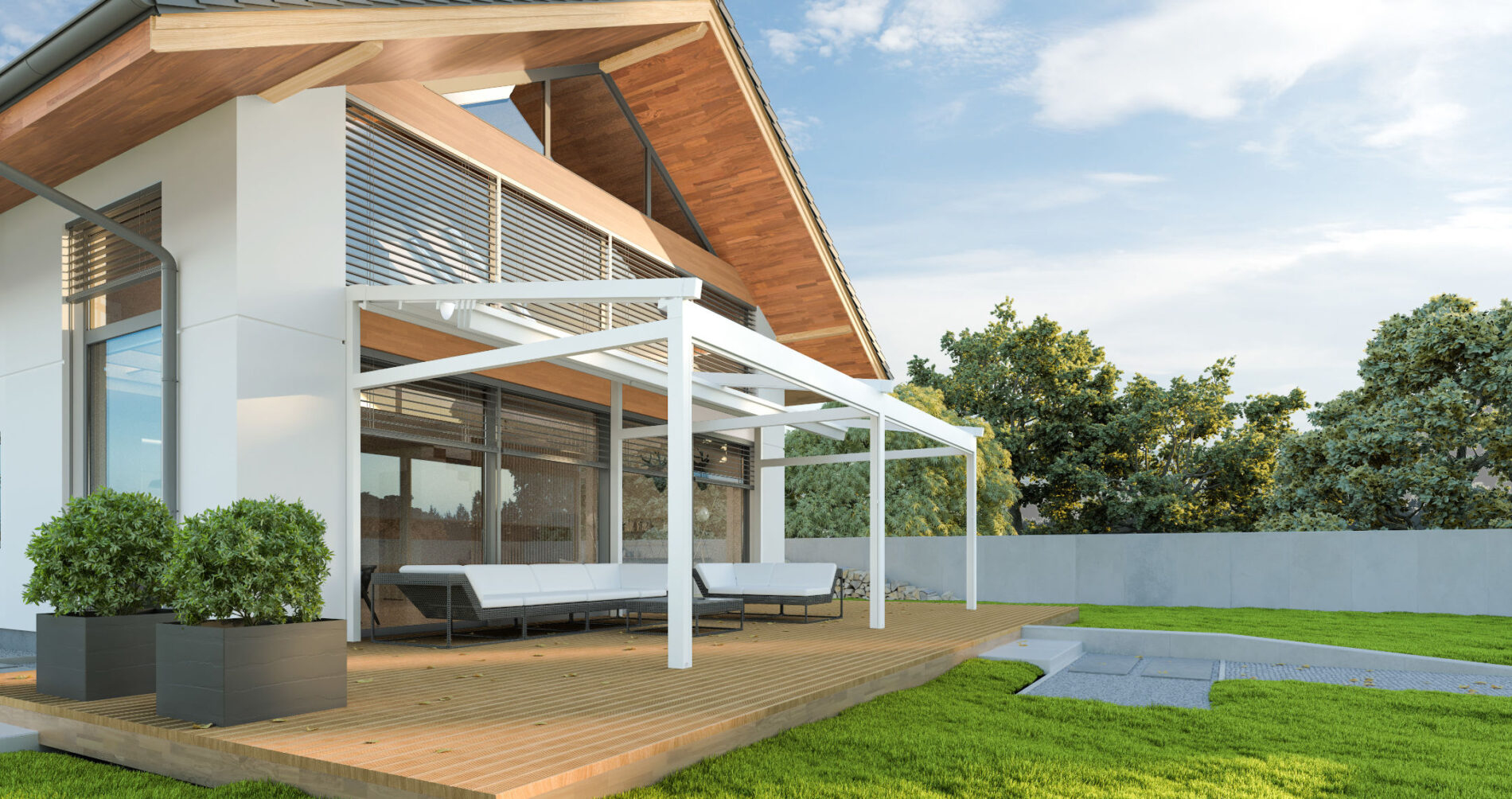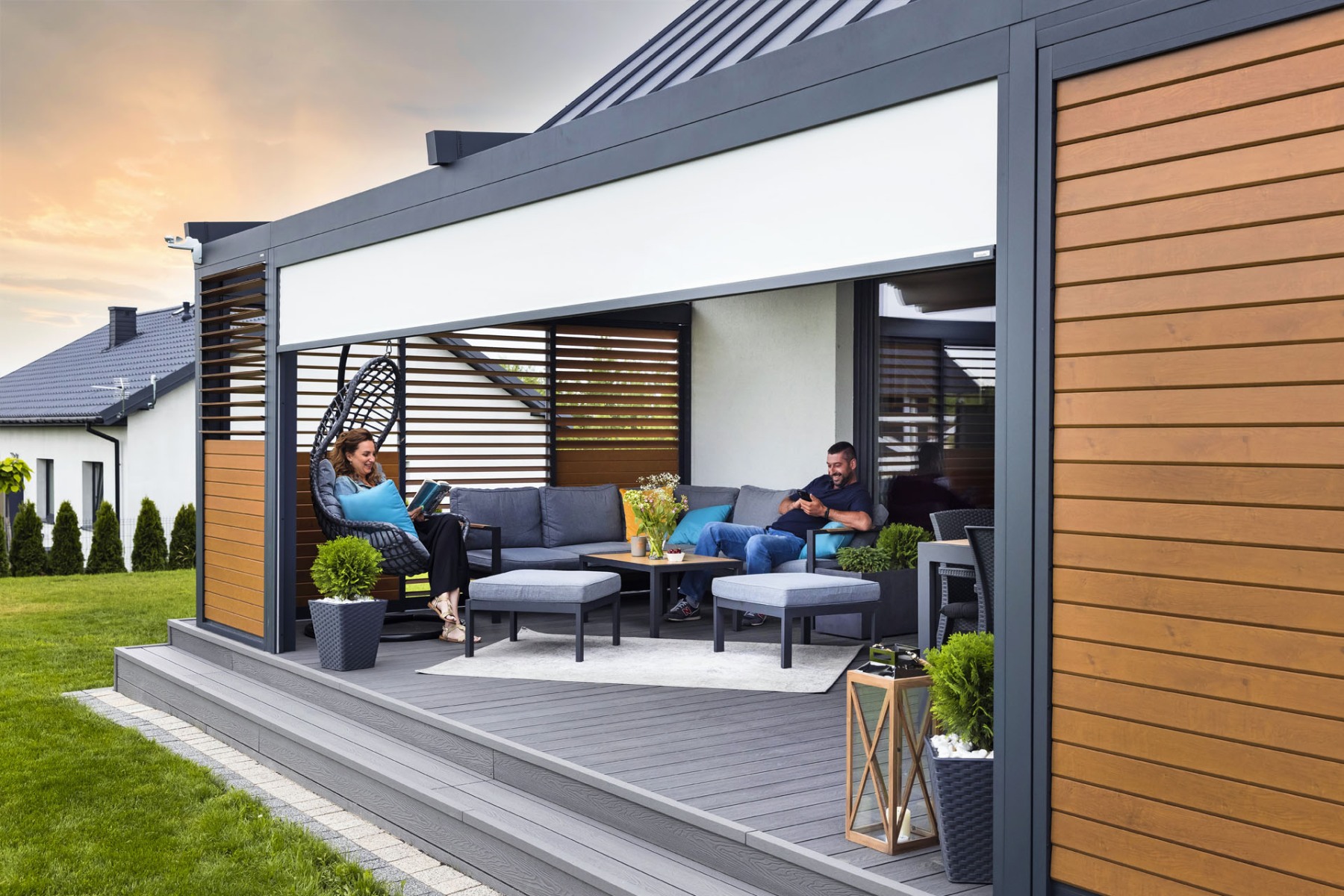 Elegancy to klasyczny model zadaszenia, który zapewnia skuteczną ochronę przed słońcem i deszczem. Trójwarstwowa tkanina zacienia taras, a spadkowa konstrukcja dachu efektywnie odprowadza wodę.