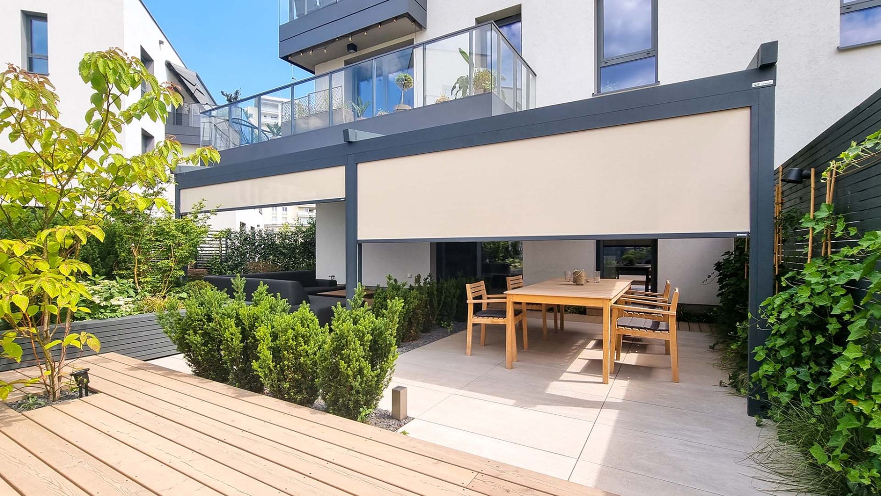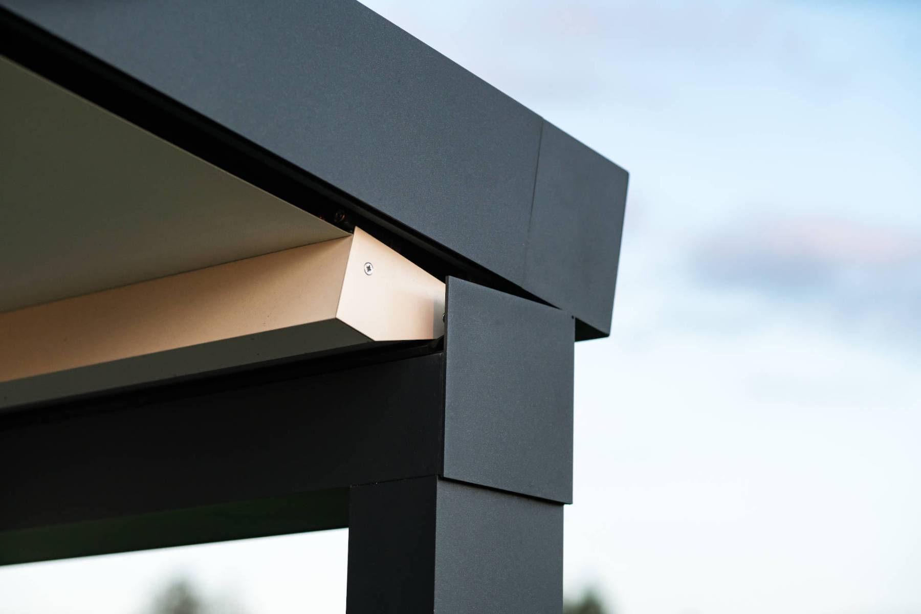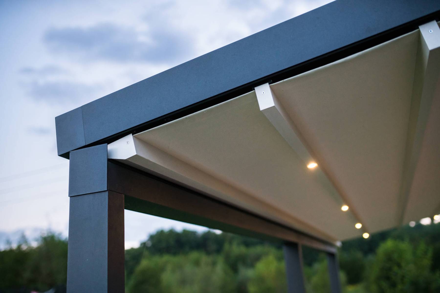 Specjalistyczna tkanina dachu, dzięki czarnej powłoce wewnętrznej zacienia przestrzeń tarasu. Zsuwany dach pozwala regulować ilość wpadającego światła. Lakier PU gwarantuje łatwość czyszczenia i podwyższoną trwałość tkaniny.