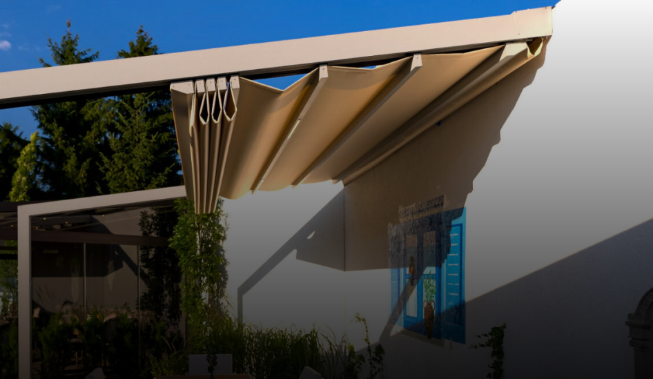 Specjalistyczna tkanina dachu, dzięki czarnej powłoce wewnętrznej zacienia przestrzeń tarasu. Zsuwany dach pozwala regulować ilość wpadającego światła. Lakier PU gwarantuje łatwość czyszczenia i podwyższoną trwałość tkaniny.
