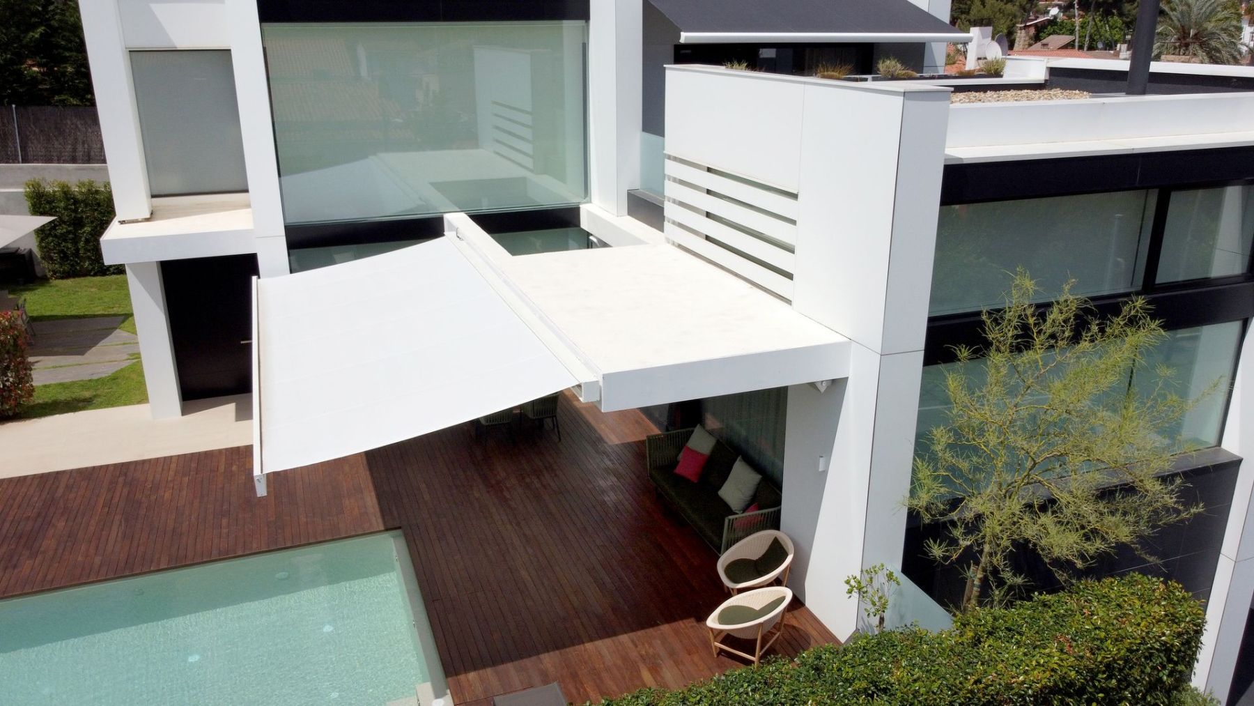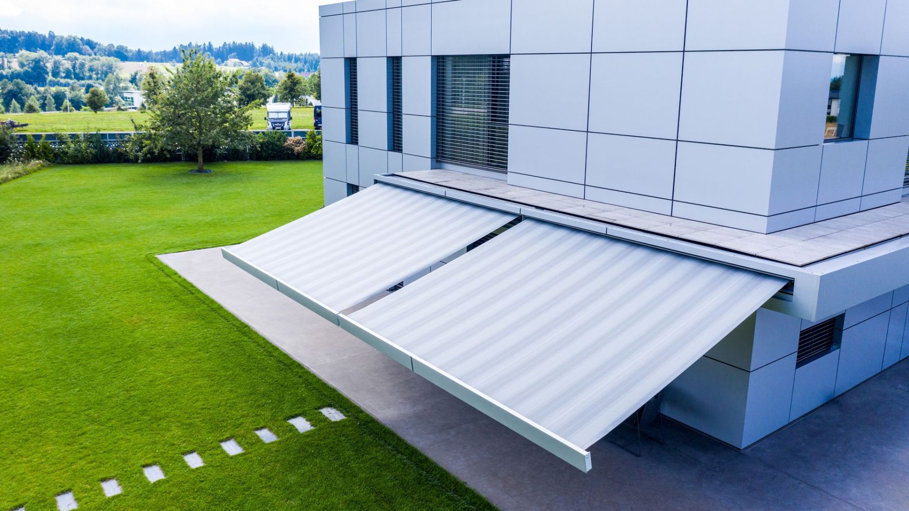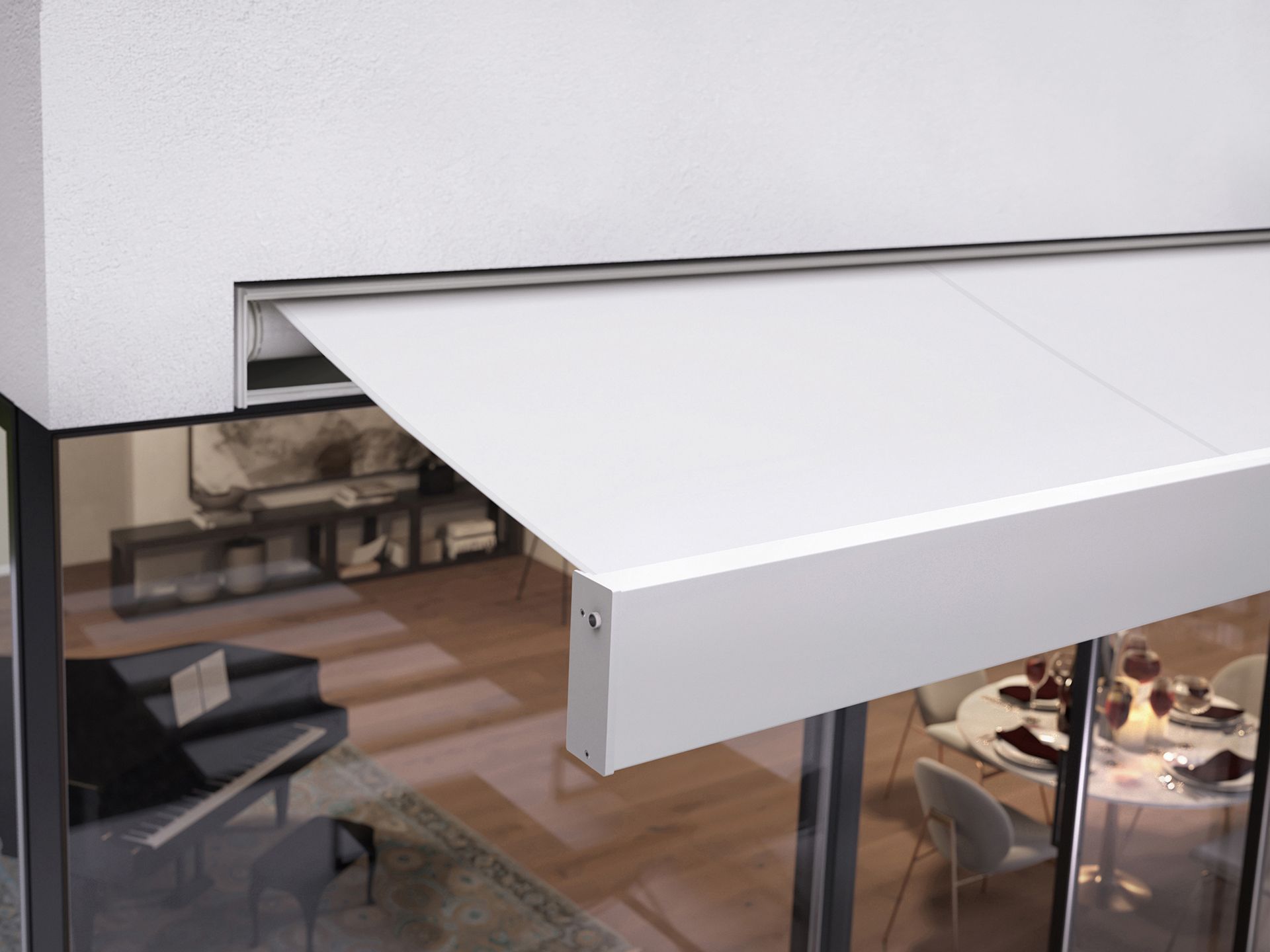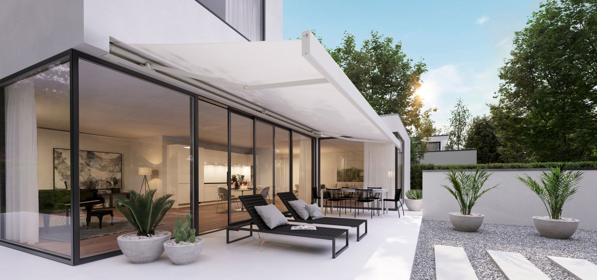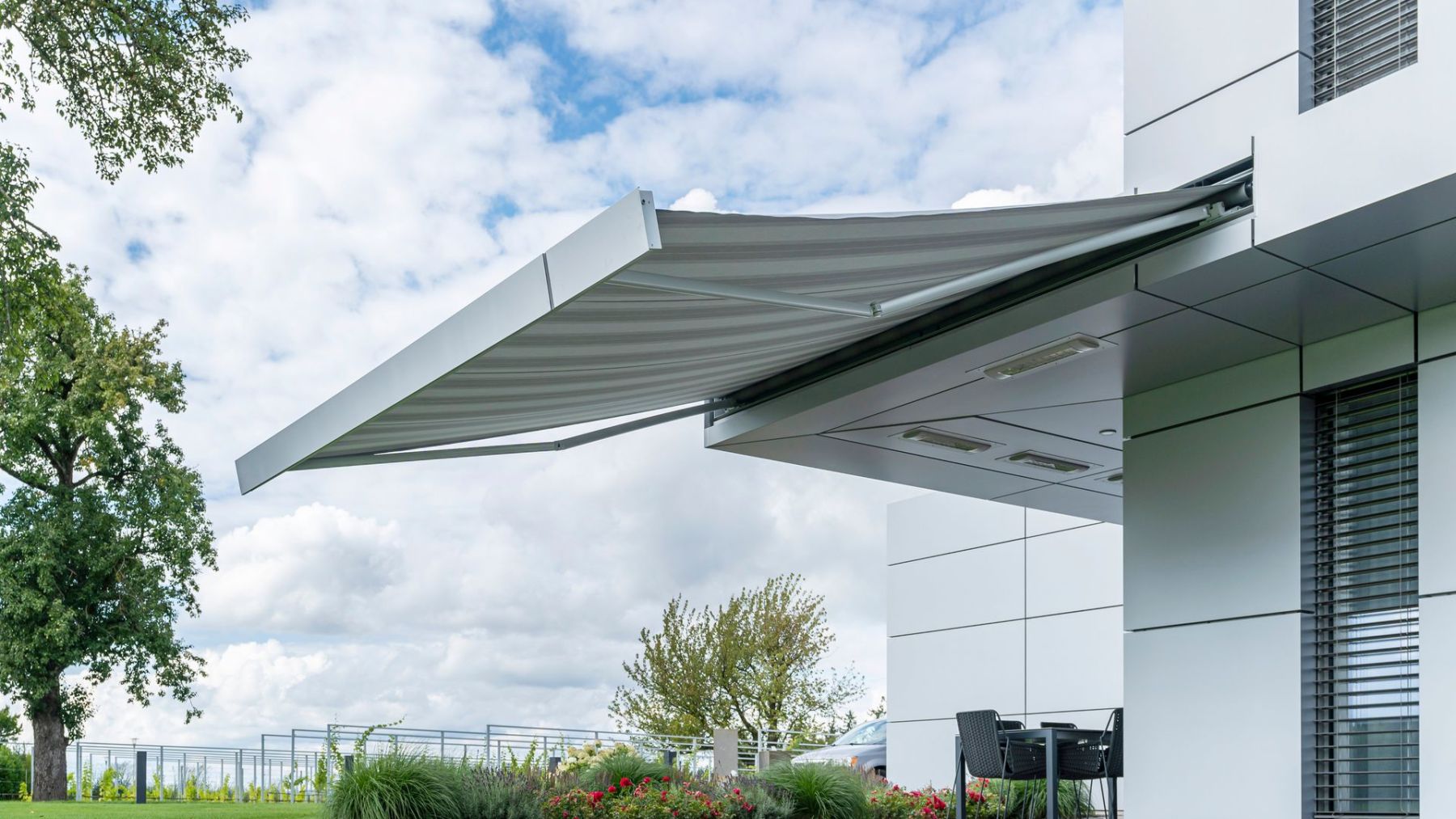 Dzięki precyzyjnemu montażowi we wnęce – w suficie lub ścianie – markiza markilux 3300 idealnie wtapia się w architekturę budynku i harmonijnie komponuje się z jego otoczeniem.