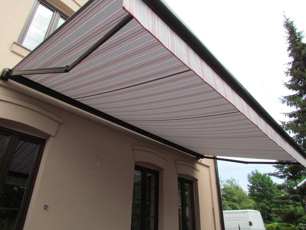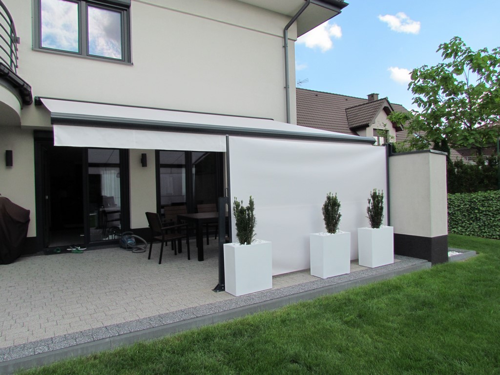 Konstrukcja wyposażona jest w aluminiowe, wzmacniane ramiona ze zintegrowaną sprężyną naciągową i łańcuchem, które zapewniają stabilną i płynną pracę nawet przy większych wymiarach markizy. Model umożliwia montaż zarówno do ściany, jak i do sufitu, a regulacja kąta pochylenia jest prosta i płynna, co pozwala łatwo dopasować zacienienie do aktualnych warunków.