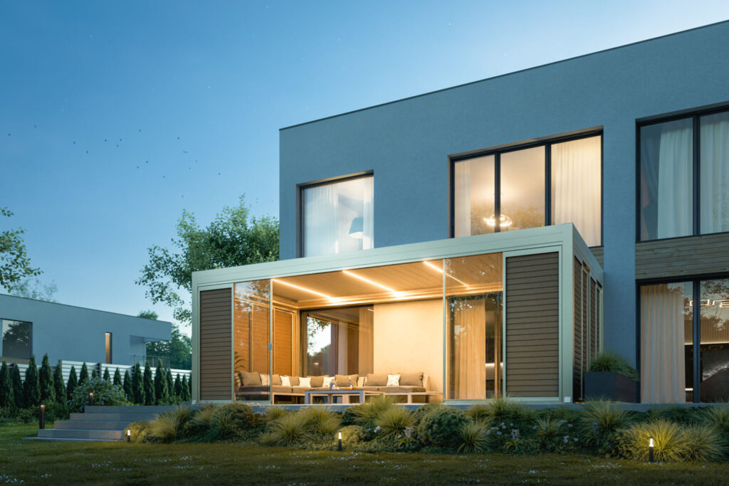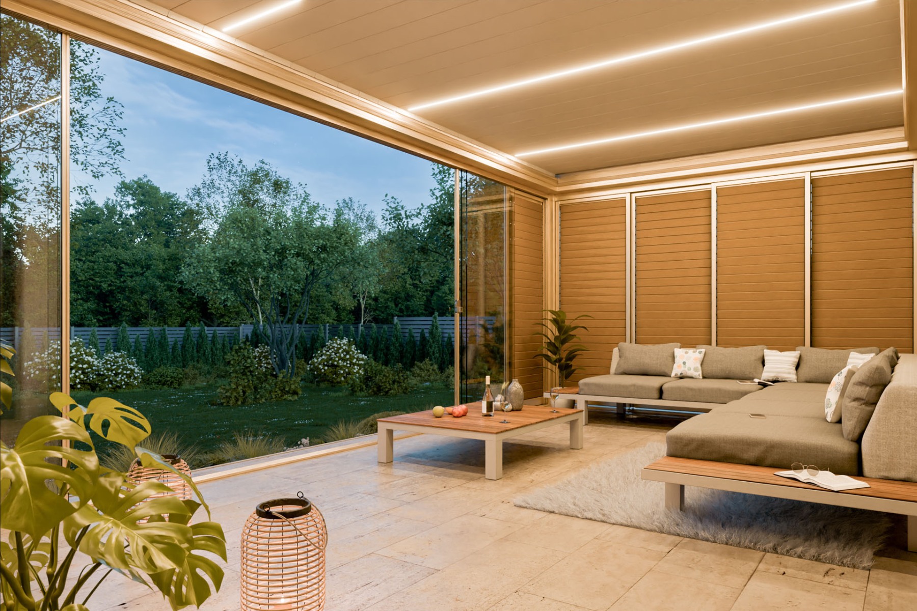 Taśmy LED pozwalają stworzyć równomierne, subtelne oświetlenie, które podkreśla nowoczesny charakter zadaszenia i zapewnia przyjemną atmosferę po zmroku.