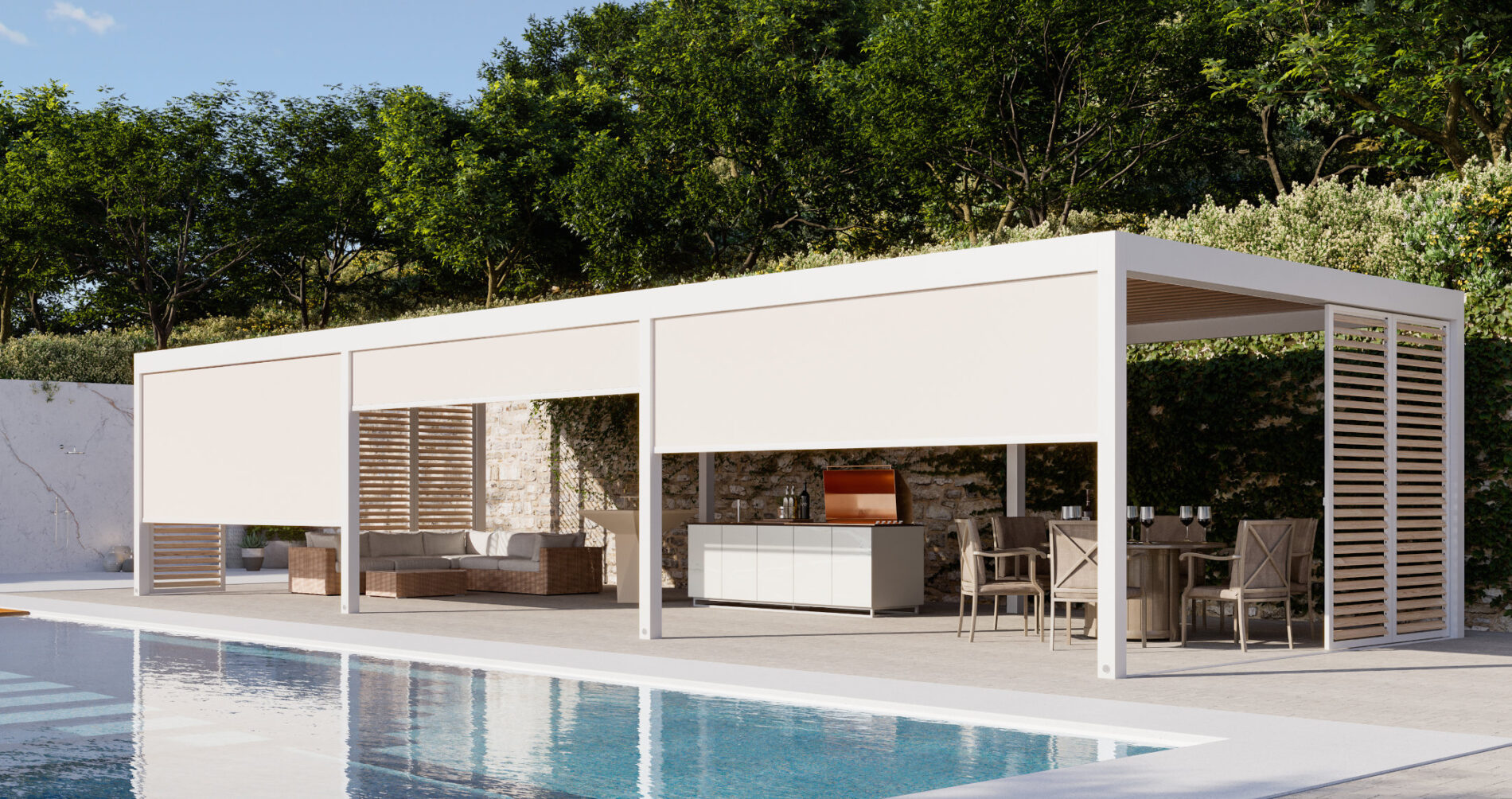 Nowoczesne pergole lamelowe skutecznie chronią przed intensywnym słońcem, deszczem oraz wiatrem. Zamknięte lamele tworzą szczelne zadaszenie odprowadzające wodę do systemu rynien ukrytych w konstrukcji. Pergole mogą być również wyposażone w dodatkowe elementy, takie jak przeszklenia boczne, rolety screen, oświetlenie LED czy promienniki ciepła, co pozwala stworzyć w pełni funkcjonalną przestrzeń tarasową.
