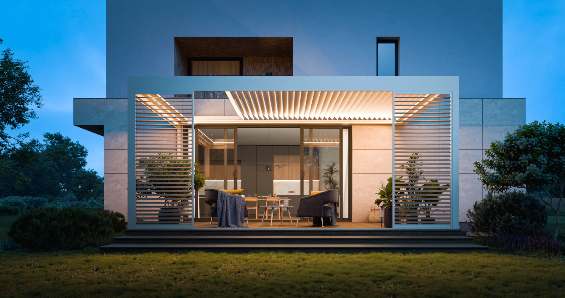 Lamelowe (bioklimatyczne) zadaszenie z zsuwanym dachem.