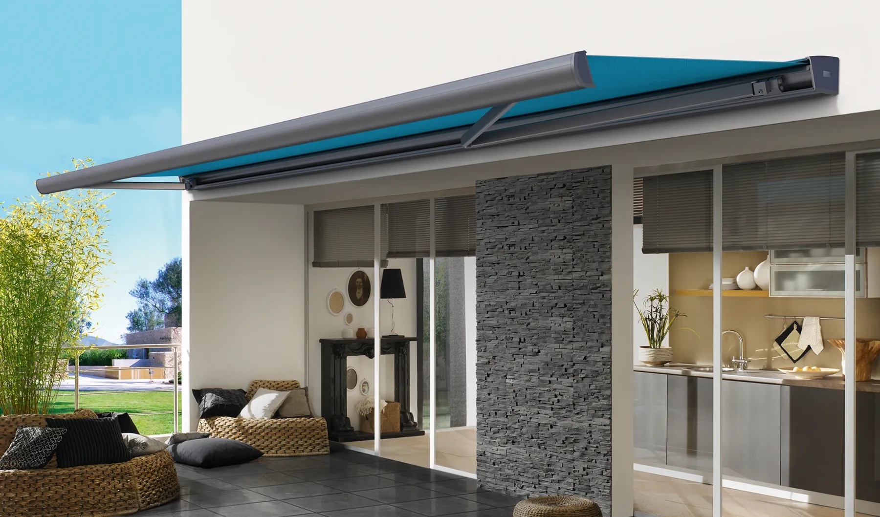 Wyraźne linie lub delikatne zaokrąglenia: dzięki dwóm wariantom designu markiza harmonijnie komponuje się zarówno z nowoczesną, jak i klasyczną architekturą przestrzeni zewnętrznych. Solidna technologia pełnej kasety oraz wysokiej jakości materiały sprawiają, że jest to idealne rozwiązanie dla dużych tarasów. Opcjonalny Vario-Volant zapewnia dodatkową ochronę przed nisko padającym słońcem.